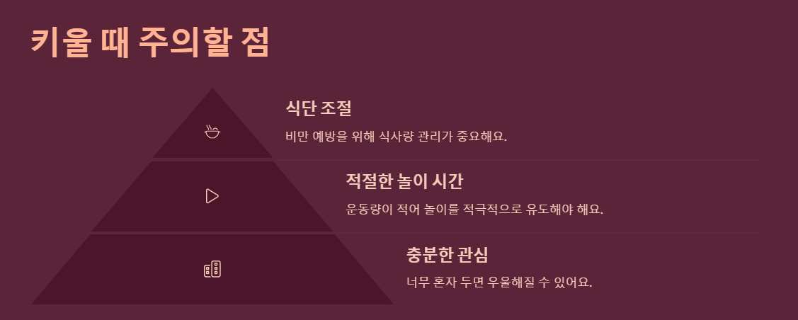 1. 비만 관리 필수! → 먹는 걸 좋아해서 쉽게 살이 쪄요.