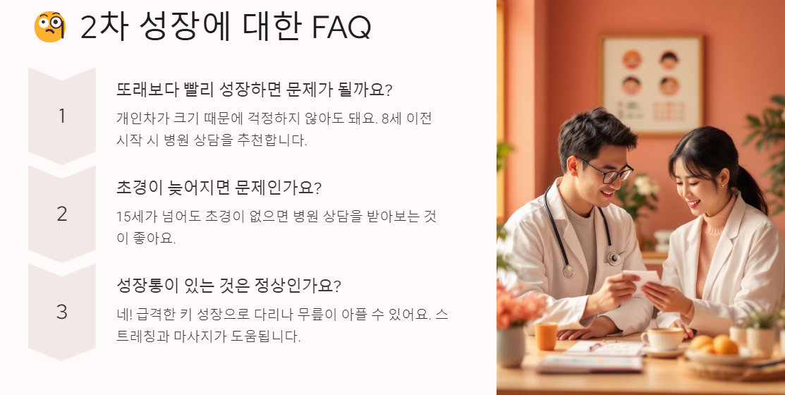 A. 개인차가 크기 때문에 너무 걱정하지 않아도 돼요. 하지만 8세 이전에 2차 성장이 시작되면 병원 상담을 추천해요.