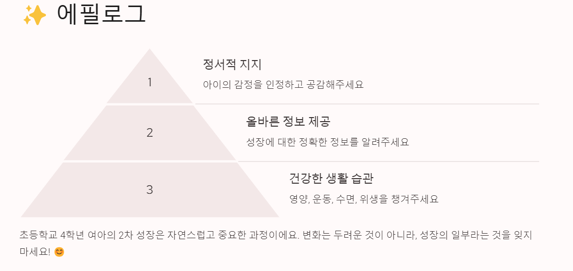 초등학교 4학년 여아의 2차 성장은 자연스럽고 중요한 과정이에요. 아이들이 건강하게 성장할 수 있도록 적절한 영양, 운동, 위생 관리, 그리고 정서적인 지지를 함께 해 주세요. 변화는 두려운 것이 아니라, 성장의 일부라는 것을 잊지 마세요! 😊