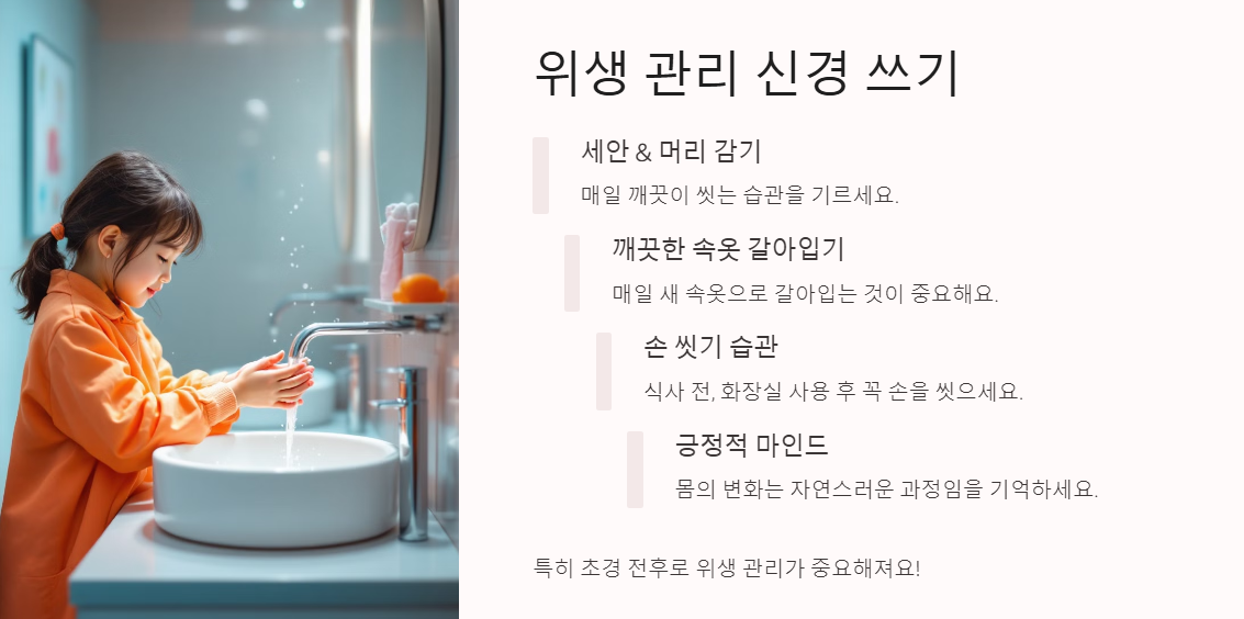 🔹 특히 초경 전후로 위생 관리가 중요해져요!