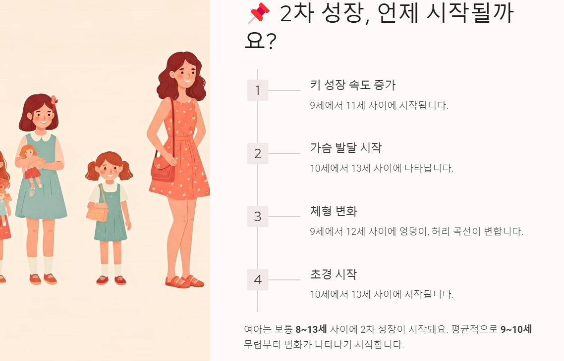 여아는 보통 8~13세 사이에 2차 성장이 시작돼요. 평균적으로 9~10세 무렵부터 변화가 나타나기 시작하며, 초등학교 4학년(10세 전후)에 본격적인 성장이 이루어지는 경우가 많아요.