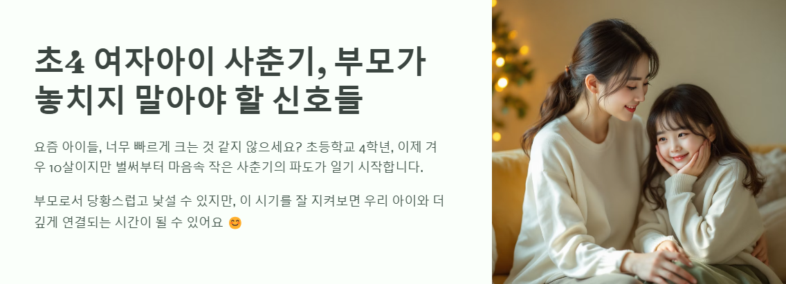 요즘 아이들, 너무 빠르게 크는 것 같지 않으세요? 초등학교 4학년, 이제 겨우 10살이지만 벌써부터 마음속 작은 사춘기의 파도가 일기 시작합니다. 부모로서 당황스럽고 낯설 수 있지만, 이 시기를 잘 지켜보면 우리 아이와 더 깊게 연결되는 시간이 될 수 있어요 😊