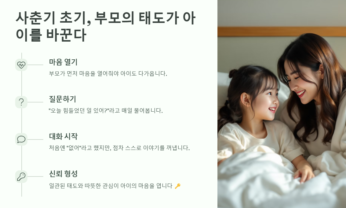 사춘기는 ‘내가 혼자가 아니구나’라고 느끼게 해주는 시간이 되어야 해요. 그래서 저는 매일 자기 전에 아이에게 “오늘 힘들었던 일 있어?”라고 물어봐요. 처음엔 그냥 “없어”라고 했지만, 점차 스스로 이야기를 꺼내더라고요. 부모의 일관된 태도와 따뜻한 관심이 아이의 마음을 엽니다 🔑