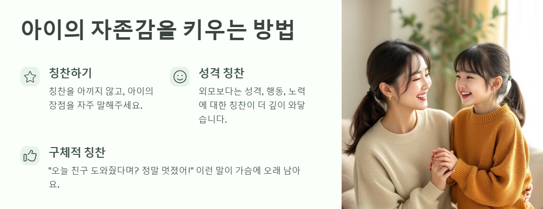 칭찬을 아끼지 않고, 아이의 장점을 자주 말해주세요. 외모보다는 성격, 행동, 노력에 대한 칭찬이 더 깊이 와닿습니다. 예를 들면 “오늘 친구 도와줬다며? 정말 멋졌어!” 이런 말 한마디가 아이의 가슴에 오래 남아요.