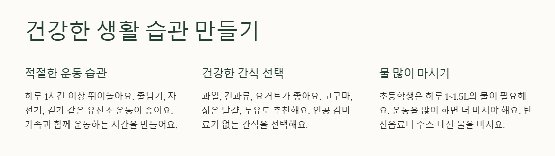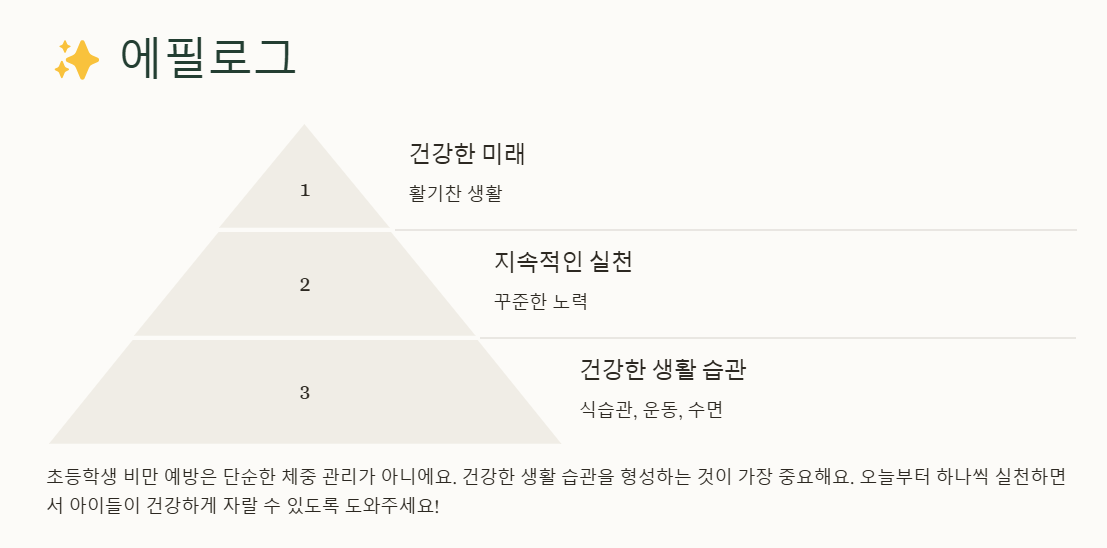 초등학생 비만 예방은 단순한 체중 관리가 아니라, 건강한 생활 습관을 형성하는 것이 가장 중요해요. 오늘부터 하나씩 실천하면서 아이들이 건강하고 활기찬 생활을 할 수 있도록 도와주세요! 😊