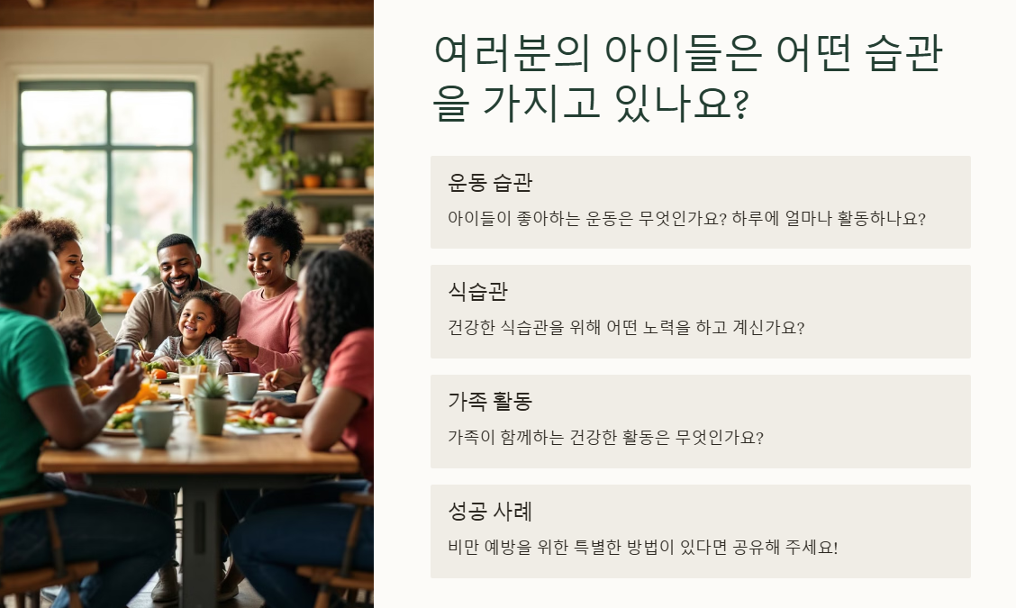 여러분은 아이들의 건강을 위해 어떤 노력을 하고 계신가요? 비만 예방을 위한 특별한 방법이 있다면 댓글로 공유해 주세요!