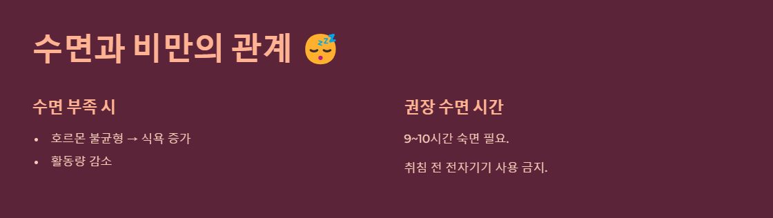 - 수면 부족 → 호르몬 불균형 → 식욕 증가 → 비만 위험 증가