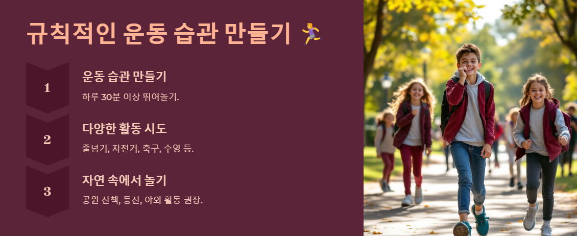 📌 부모 TIP: "운동해!"라고 강요하기보다는 함께하는 것이 좋아요! 가족이 함께 산책하거나 주말에 야외활동을 계획해 보세요.