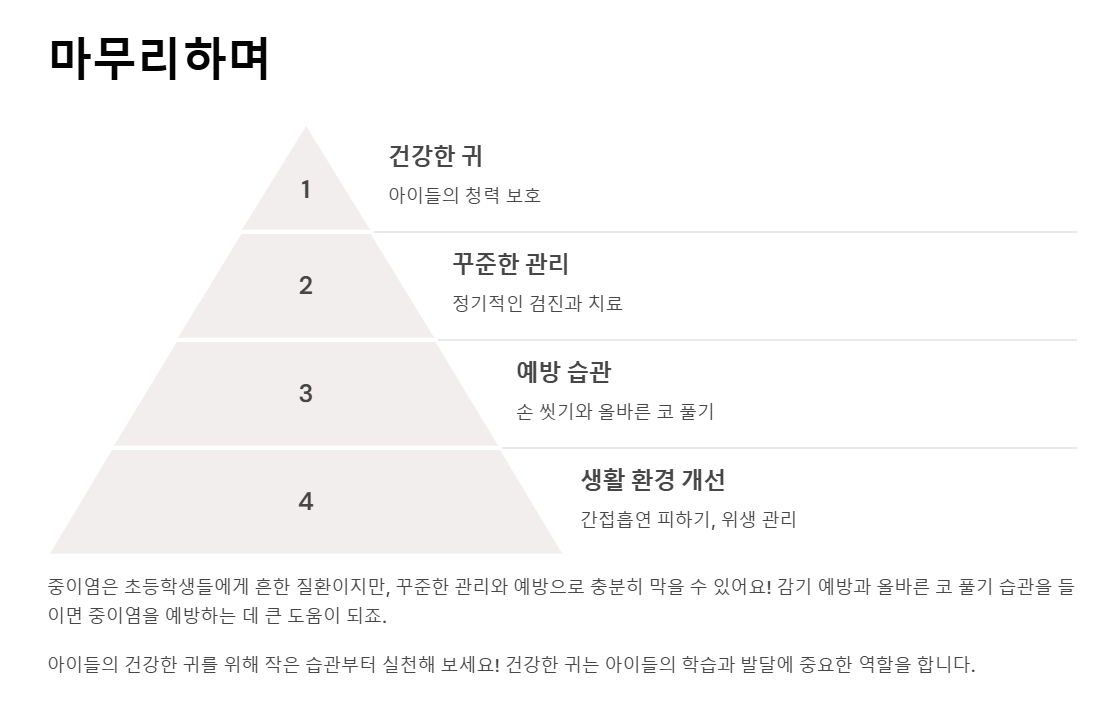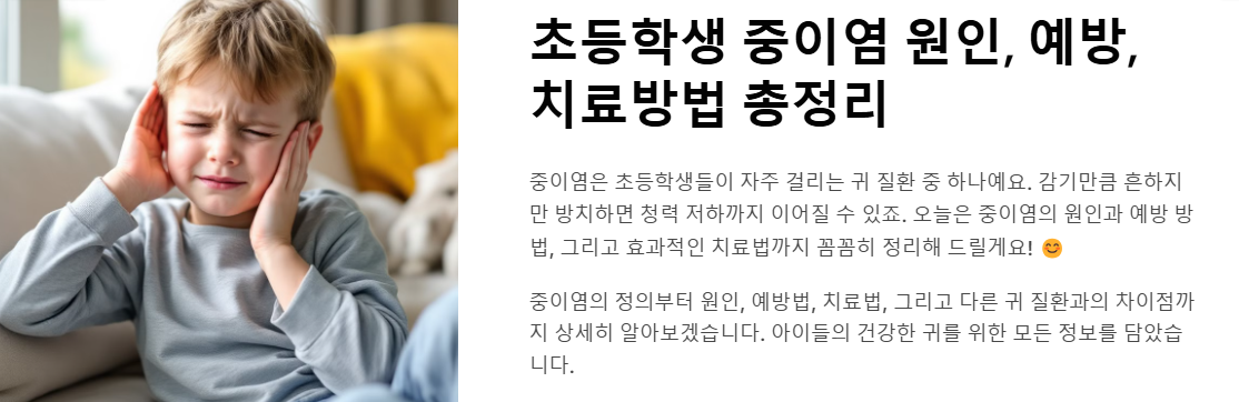 중이염은 초등학생들에게 흔한 질환이지만, 꾸준한 관리와 예방으로 충분히 막을 수 있어요! 감기 예방과 올바른 코 풀기 습관을 들이면 중이염을 예방하는 데 큰 도움이 되죠. 아이들의 건강한 귀를 위해 작은 습관부터 실천해 보세요!