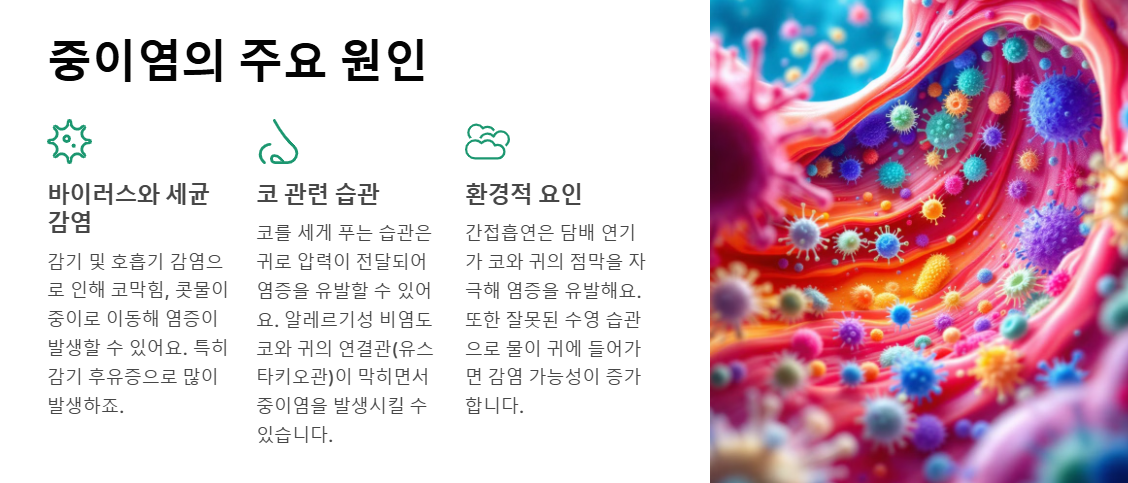 중이염의 주요 원인은 바이러스와 세균 감염이에요. 특히 감기 후유증으로 많이 발생하죠.