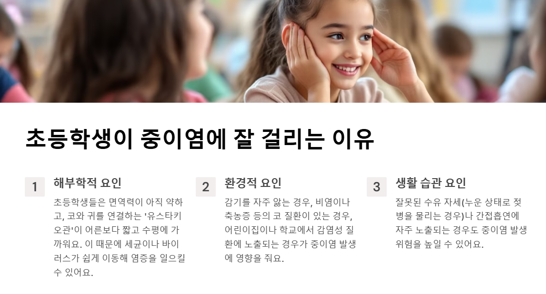 초등학생들은 면역력이 아직 약하고, 코와 귀를 연결하는 ‘유스타키오관’이 어른보다 짧고 수평에 가까워요. 이 때문에 세균이나 바이러스가 쉽게 이동해 염증을 일으킬 수 있어요.
