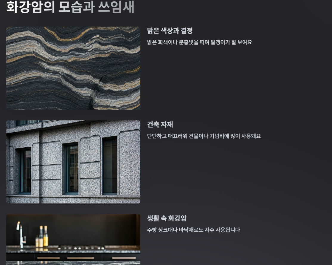 화강암은 밝은 색을 띠고, 알갱이가 잘 보이는 돌이에요. 땅속 깊은 곳에서 오랜 시간 천천히 식어서 단단하고 매끄러워요. 그래서 건물이나 기념비, 무덤 등에 많이 사용돼요. 우리가 흔히 보는 회색 계열의 튼튼한 돌이 바로 화강암이랍니다. 🏗