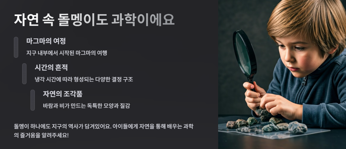 돌멩이 하나에도 지구의 역사가 담겨있답니다. 그냥 돌이 아니에요. 마그마가 식는 과정, 시간이 만드는 알갱이들, 바람과 비가 만드는 모양들… 모두 과학이에요! 아이들에게 자연을 통해 배우는 과학의 즐거움을 알려주면 어떨까요? 🌍