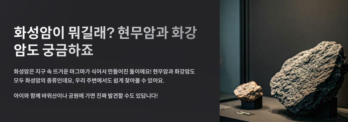 화성암은 지구 속 뜨거운 마그마가 식어서 만들어진 돌이에요! 현무암과 화강암도 모두 화성암의 종류인데요, 우리 주변에서도 쉽게 찾아볼 수 있어요. 아이와 함께 바위산이나 공원에 가면 진짜 발견할 수도 있답니다! 🪨