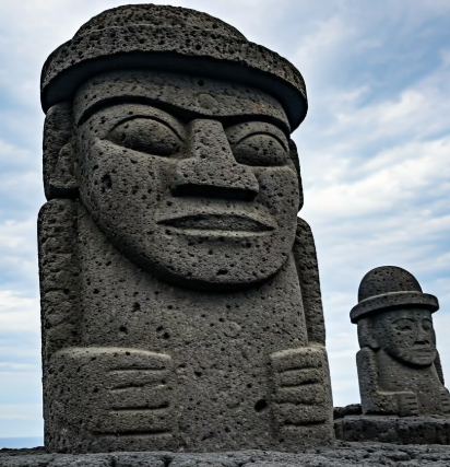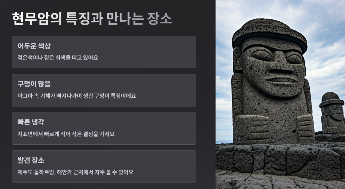 현무암은 어두운 색을 띠고, 구멍이 송송 나 있는 게 특징이에요. 마그마가 땅 밖으로 나와서 빠르게 식을 때 생기기 때문에 구멍이 많고 가벼운 느낌이에요. 제주도에 가면 '돌하르방'도 현무암으로 만들어졌어요! 바닷가 근처에서 자주 발견된답니다. 🌊