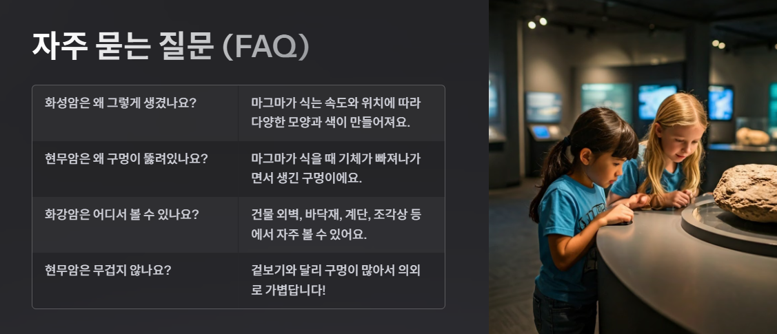 화성암은 지구 속 뜨거운 마그마가 식어서 만들어진 돌이에요! 현무암과 화강암도 모두 화성암의 종류인데요, 우리 주변에서도 쉽게 찾아볼 수 있어요. 아이와 함께 바위산이나 공원에 가면 진짜 발견할 수도 있답니다! 🪨